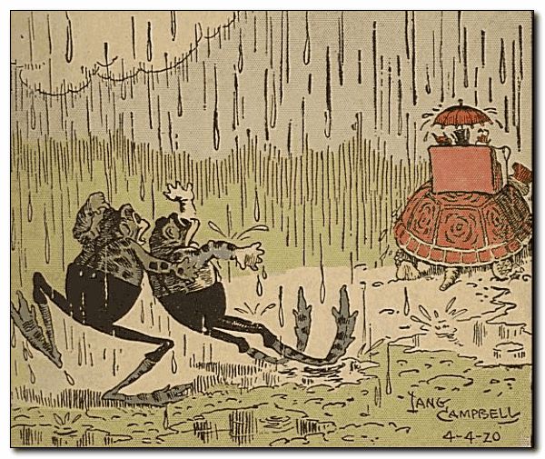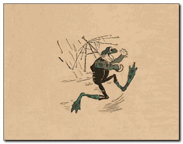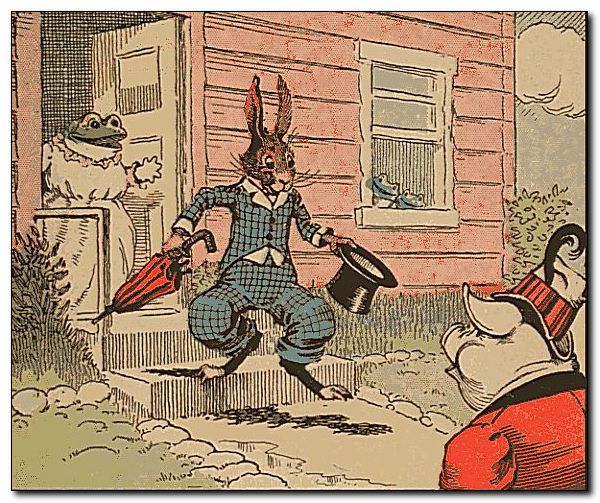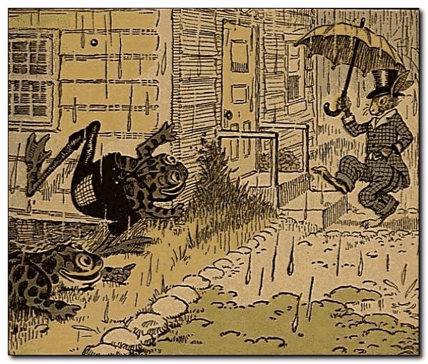 One day, early in April, when showers happen every little while, Uncle Wiggily Longears, the nice bunny rabbit gentleman, went to call on Mrs. No-Tail, the frog lady, who was the mother of Bully and Bawly, the two froggie boys, but he had his umbrella, and his new spring suit did not get wet. It was pouring hard when the bunny reached Mrs. No-Tail’s house, and Bully and Bawly, who, of course, did not mind getting wet, saw Mr. Longears. “Let’s play a joke on him!” croaked Bully. “Let’s play a nice joke on Uncle Wiggily!”