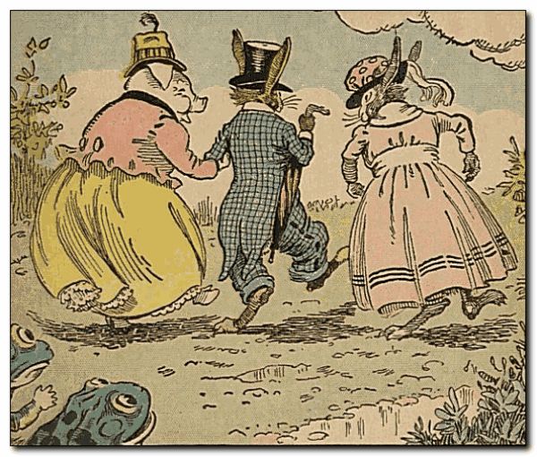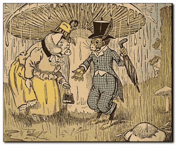 As Uncle Wiggily walked along with Mrs. Twistytail, the pig lady, he carried his umbrella, furled like the sail of a boat, under his paw. All of a sudden it began to April shower again, just as the rabbit gentleman and the lady pig passed near a large toad stool. “Oh, let’s get under that, and you will not have to raise your umbrella,” said Mrs. Twistytail, and they were soon sheltered from the storm. “If he never raises his umbrella he’ll never know what a joke we played on him,” said Bawly. “Wait,” advised Bully.