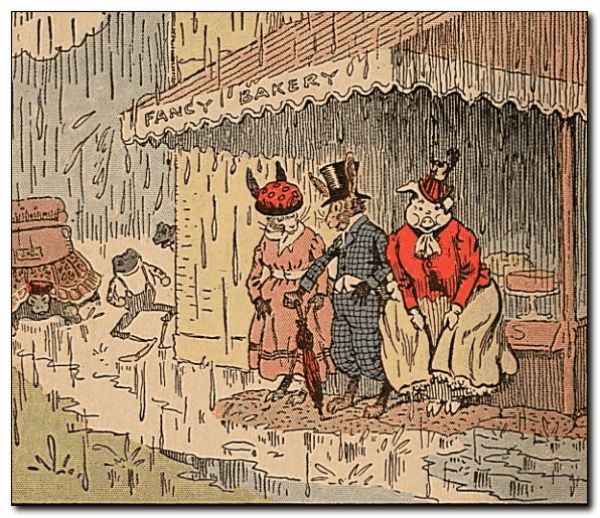 Just as Uncle Wiggily and Mrs. Twistytail and Mrs. Littletail reached a bakery, where there was a nice, big awning, it began to rain again. “Oh, let’s run for shelter under the awning!” cried Mrs. Twistytail. “It will keep us as dry as the toad stool did, Uncle Wiggily!” So all three hurried under the awning, hardly a drop of water getting on them. “You do not seem to need your umbrella, Uncle Wiggily,” said Mrs. Littletail. “This is the second time you found shelter.” Uncle Wiggily said he was lucky. The frog boys waited.
