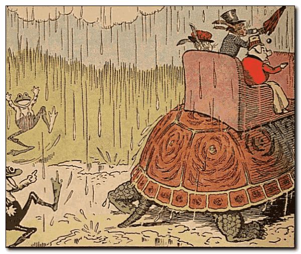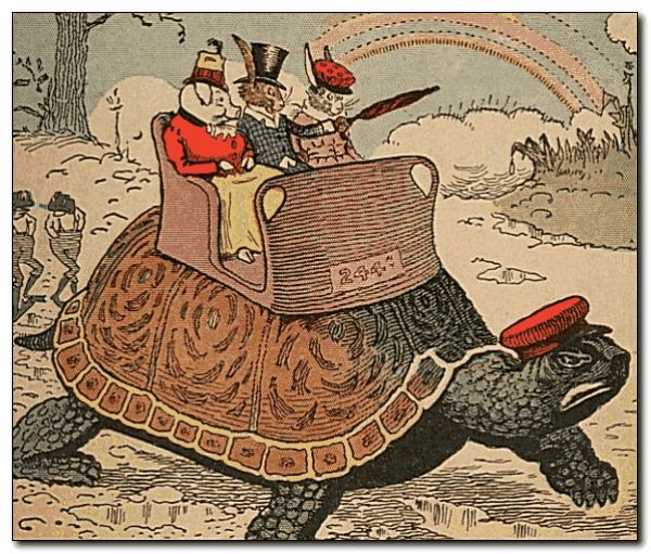 “Taxi! Taxi!” called Uncle Wiggily, as he saw the turtle gentleman’s automobile cruising along through the puddles in front of the bakery shop awning. “Here, Taxi! I’ll ride home with the ladies.” So Uncle Wiggily and the ladies got in the turtle taxicab and, with his umbrella, Uncle Wiggily pointed to the rainbow. “We shall be home before another shower,” he said. “But, even if it rains, I still have my umbrella.” Bully and Bawly, splashing through the puddles behind the turtle taxicab, looked at one another.