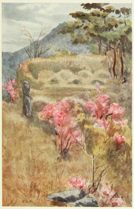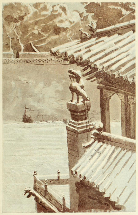 It was by no means a promising morning when we set out, but our time was limited, and we had persuaded the doctor to take an unwonted holiday from his strenuous labours, so delay was impossible. Where no guide-books are obtainable, it is doubly valuable to have kind friends willing to place their knowledge at your disposal, and doctors are skilful at smoothing other things as well as pillows; in fact I can give no better advice to travellers than to try and secure the help of the medical missionary—the busier the better—as a guide to all that is best worth seeing in the foreign field. Dr. Young had kindly procured for us the requisite permit to visit the tombs, which can only be obtained through the British Consul. We set out in a weird glass chariot, quite suggestive of Cinderella’s coach; it had windows the whole way round, and was lined with mouse-coloured plush, not to mention a fine mirror opposite to us. We had a retainer standing on a step behind, who spent all his time jumping on and off, as he required to lead the horse round every corner and over every obstacle in the road. Passing outside the city we saw an endless stretch of graves beyond graves; then we came to a beautiful park-like place where lilies of the valley grow thickly in the spring—but alas! people are digging them up so ruthlessly, that it is to be feared there will soon be none left. The trees seemed to grow finer and finer as we neared the tombs. The wall surrounding them has been damaged by its occupation during the war, when the Japanese troops took[18] possession and were attacked by the Russians: the wall is riddled by bullets, but it is astonishing how comparatively little damage had been done. The gateway is beautifully decorated with green tiles, and there are handsome large green medallions set in the Venetian red wall. Inside is a fine avenue of hoary trees leading to the main avenue, in which are some curious stone animals; these are so familiar to us by photos and by the description of other travellers, that it is unnecessary for me to attempt it. They form but a detail of the fine effect which is created by the lofty buildings among the trees, enclosed within a high wall. The colouring of the building—mellowed by time—is superb, and as we saw it under the fast falling snow, was most impressive.