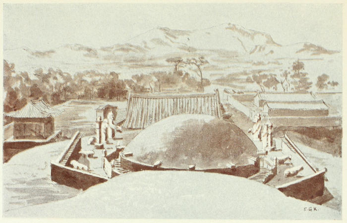 These Peking tombs date back to the time of the Ming dynasty, which ended in 1644, and the Moukden tombs are considerably later. Their whole design is taken direct from the former, and there is no attempt to introduce any Manchu characteristics. The reason for this is obvious; the Manchus were emerging from a state of barbarism, and possessed no architecture worthy of the name.