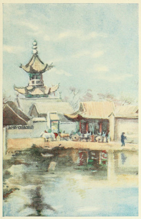We travelled slowly, though occasionally our little ponies would break into a trot; then the driver would leap into the air, fold his legs beneath him and alight seated cross-legged on the cart, with a solid thud, like some gigantic frog. Hulan is quite a Chinese town, and indeed Manchuria is rapidly becoming populated with the Chinese, for whom its fertile plains offer an excellent home. The old Manchu towns are in a decadent condition, and can only hope for a fresh lease of life by new blood being introduced from the south. No wonder the Japanese cast covetous eyes on the land where crops produce an increase of 100 per cent. The crops are mainly wheat and beans, both of which are being largely exported to Britain. Great quantities of oil are obtained from the beans, and the refuse is made into large flat cakes, nearly as big as cart wheels, which form excellent fuel. The price of beans in the north is three times as great as it was a year ago, and the people in Manchuria are on the whole more prosperous than elsewhere in the Chinese Empire.