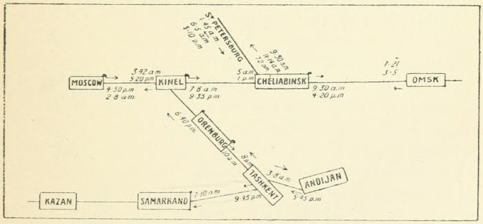 After dinner we regretfully set out for the station to pursue our way to the still more attractive city of Samarkand. The train was crowded, but as we arrived in good time we secured a coupé to ourselves, a most important matter with a journey of some fourteen hours before us. During the night we heard a crash of glass in the adjoining carriage; evidently it was merely accidental, for we heard nothing further; but it accounted for the rigid scrutiny to which the railway carriages are continually submitted in the course of every journey by the conductors, who keep the compartments always locked when unoccupied. One is never allowed to forget the hateful system of espionage, that has been brought to a rare perfection throughout the Russian Empire.