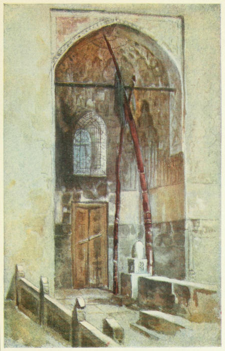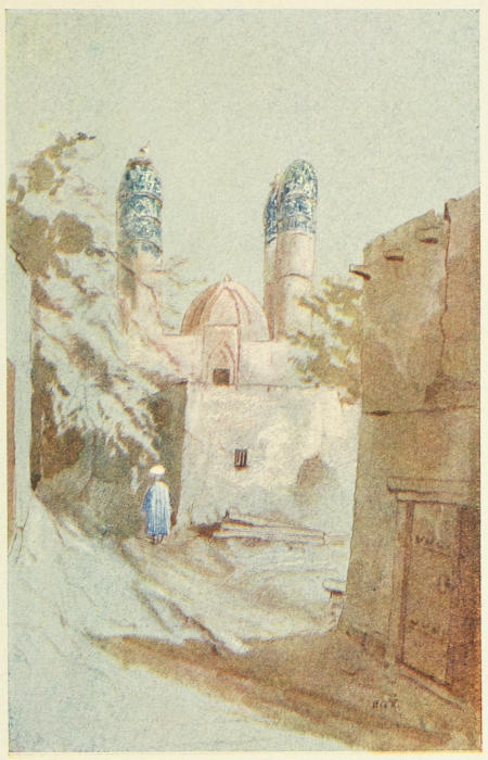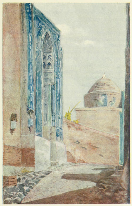 As we strolled along the shady paths veiled women eyed us furtively. A few minutes’ walk brought us to a short flight of steps leading down to a fine blue-tiled gateway. As we entered it a vista of great beauty, a masterpiece of art, was revealed, which had previously been completely hidden from view. Forty gleaming marble steps lead upward to a fine gateway, surmounted by domes. A flowering shrub hung over the wall on the right, and a cluster of scarlet poppies had forced their way between the slabs of marble. In the porch sat a typical group of natives, and our guide presented us with some ceremony to the Mullah, who was apparently in charge of the buildings—the Hazréti Shah Zindeh, or summer palace of Tamerlane. The palace is called after a saint, Shah Zindeh, whose tomb is one of the buildings; in fact it would never occur to any one that this was a palace, but rather a collection of shrines and tombs.[216] The saint is expected to rise again some day. On reaching the top of the steps we came into a little flagged lane, with the most brilliant archway standing up against the sky (the one in the sketch), such a blaze of scintillating colour that the blue heaven looked dull and opaque in comparison. Here the tiles are finer than any of the others; they are modelled in relief and in open work, unlike any that we saw elsewhere. The designs were of an infinite variety, and it seemed a grievous pity that the little hall within was dirty and befouled by birds nesting there; all the walls within, as well as without, were covered with various kinds of tiles. Opposite this was another hall, quite different in its decoration. A little further down the winding lane were another pair of halls, also surmounted by domes, and with yet other designs on the walls; there are altogether seven of them, the remaining three being grouped together at the extreme end of the lane, and forming the termination of it. The innermost shrine is a little mosque, consisting of two rooms, a sort of holy of holies. On the wall I noticed a rough colour print of the Kaaba, and named it to our guide. He was greatly interested, and asked if I had ever been to Mecca, and I fancy reckoned me at once one of the faithful.