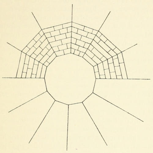 But Tamerlane was so afraid lest cupidity should cause his tomb to be rifled that he ordered his body to be buried in a crypt below the other tomb, the existence of which was until quite recently unknown, except to a few initiated persons. The entrance, which was concealed by a paving stone, is now open to the gaze of all. We went down into it by a flight of steep stone steps and found a number of tombs, one of which was the hero’s, made of specially finely carved marble. We were invited to pay a small sum in order to place candles on it, so I presume our respectful attitude had won us the reputation of being good Moslems. The vaulted roof of this crypt was admirably designed brickwork, of which the rough sketch opposite may give an idea. It was a twelve-sided figure, and the whole of the interior was in excellent repair. It was dimly lighted by a torch, which our guide produced, and we were glad to escape promptly back to the upper air, where I sat down to sketch. Various worshippers came in and out to say their prayers, for the worship of saints is a marked characteristic of Mohammedanism, and there are many shrines in Samarkand. Every one seemed friendly and devout, except an obvious tourist with his guide, who certainly disturbed the serenity of the atmosphere.