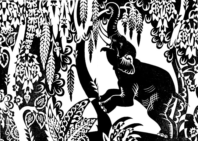 When I opened them again, I saw that the bull was tugging at the rope that held him by the horn and kept him from butting into the tree behind which Ghond stood. His monstrous bellowing filled the jungle with a fearful racket. Echoes of it coursed one after another like frightened shrieking children.