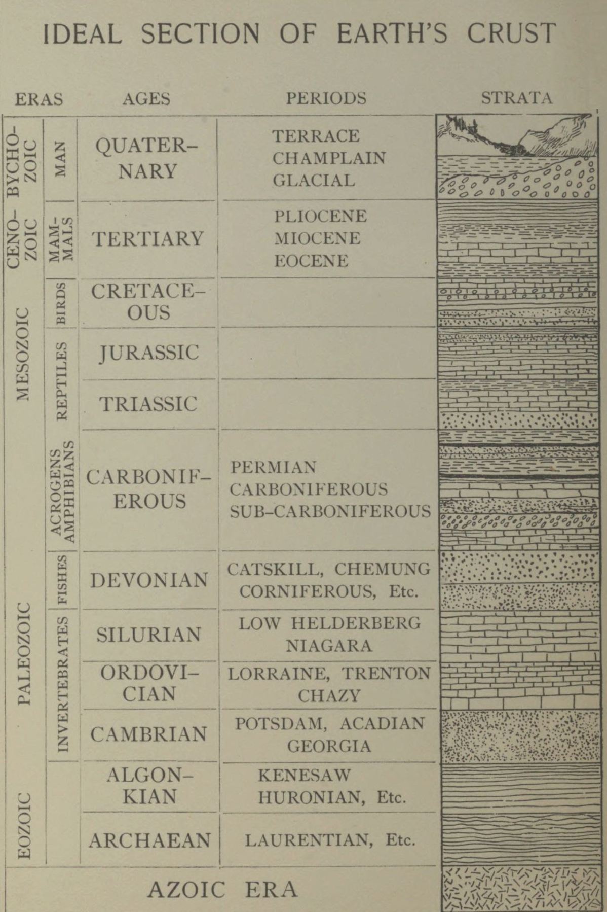 | PALEOZOIC | FISHES | DEVONIAN | CATSKILL, CHEMUNG, CORNIFEROUS, Etc. | |