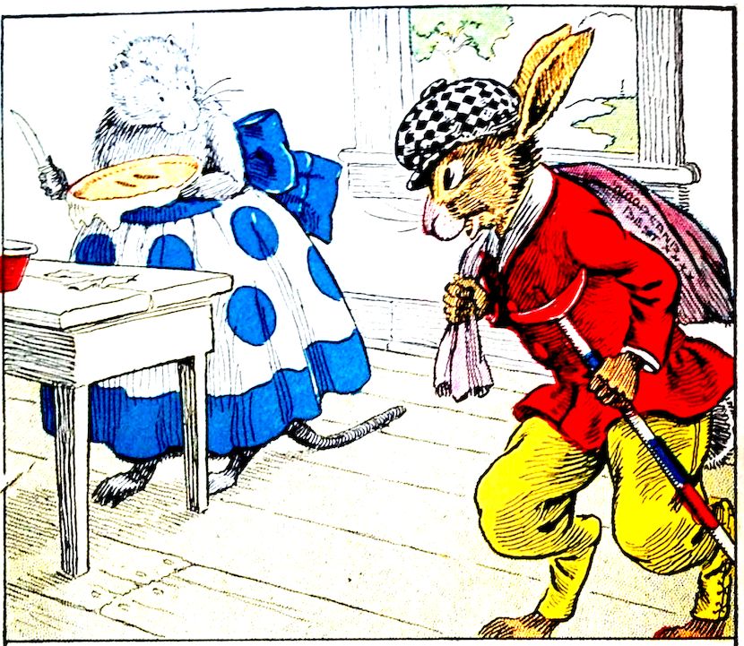 “So you are going fishing, are you?” Nurse Jane called after the bunny rabbit gentleman who hopped down the road. “Yes,” he answered. “You gave me a bit of clothes line, I’ll use my rheumatism crutch for a pole, the dull hammock hook will not hurt the fish, and for bait I’ll give them some of the cherry pie you put up for my lunch.” Nurse Jane waved her paw, and said she hoped the bunny gentleman would have good luck and bring home plenty of fish. “Uncle Wiggily thinks he’ll catch something,” said the Pipsisewah to Skeezicks, “but we’ll catch him!”
