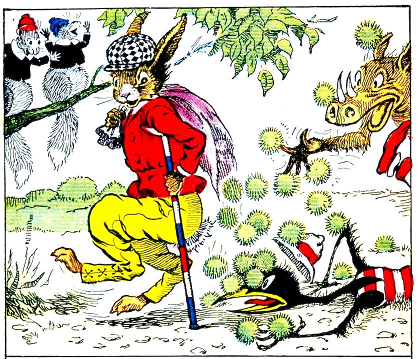 Uncle Wiggily hopped and jumped through the woods, with the empty flour sack over his shoulder. He was thinking how good the nut cake would taste when, all of a sudden, the bunny rabbit gentleman came to a big pile of chestnuts under a tree. The wind has blown them down, but they were still in the stickery, prickery burrs, Jack Frost not having cracked them open. Uncle Wiggily did not know as much about chestnuts as did Johnnie and Billie, the squirrels, and picked up the nuts with his bare paws. “Ouch,” he cried. “I’m stuck full of splinters!”