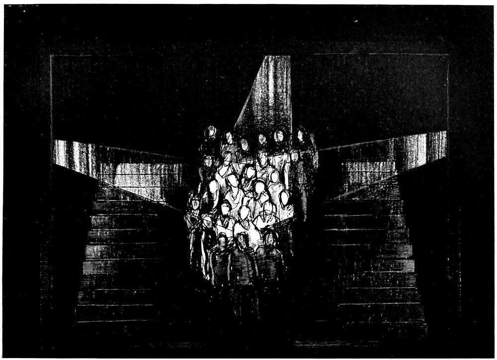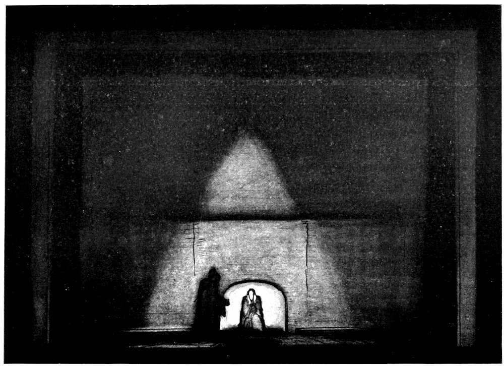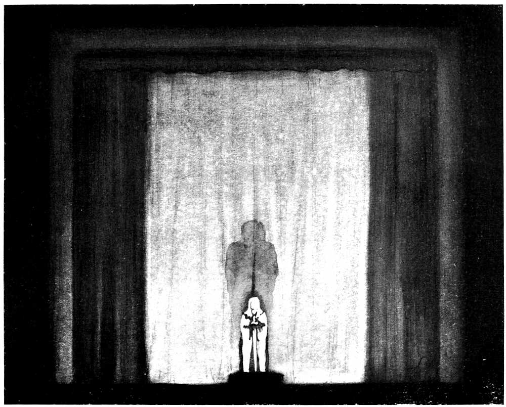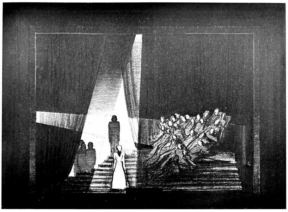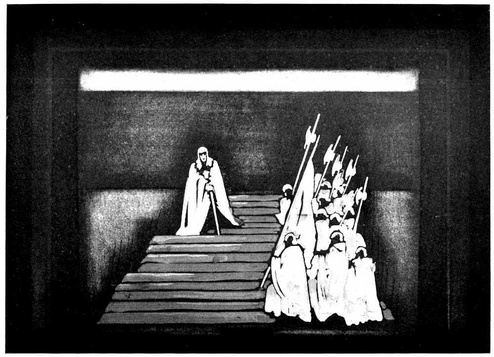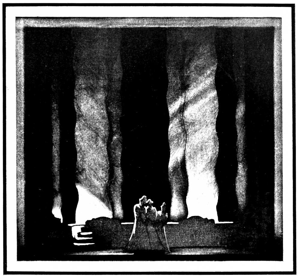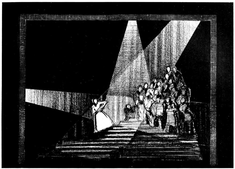 | From Appia’s theories of the ’nineties to the day of projected scenery. Lamps of six thousand candle-power. Color comes under control. The dome no longer a sky; a neutral boundary in Jessner’s Othello, a void in Masse-Mensch, a wall to be painted with light in a Stockholm ballet. Settings projected by Linnebach and Hasait. Light as a dramatic motif. | ||