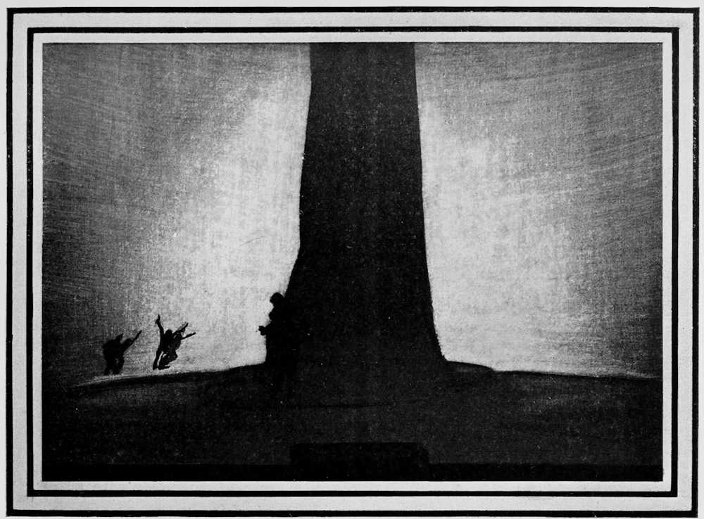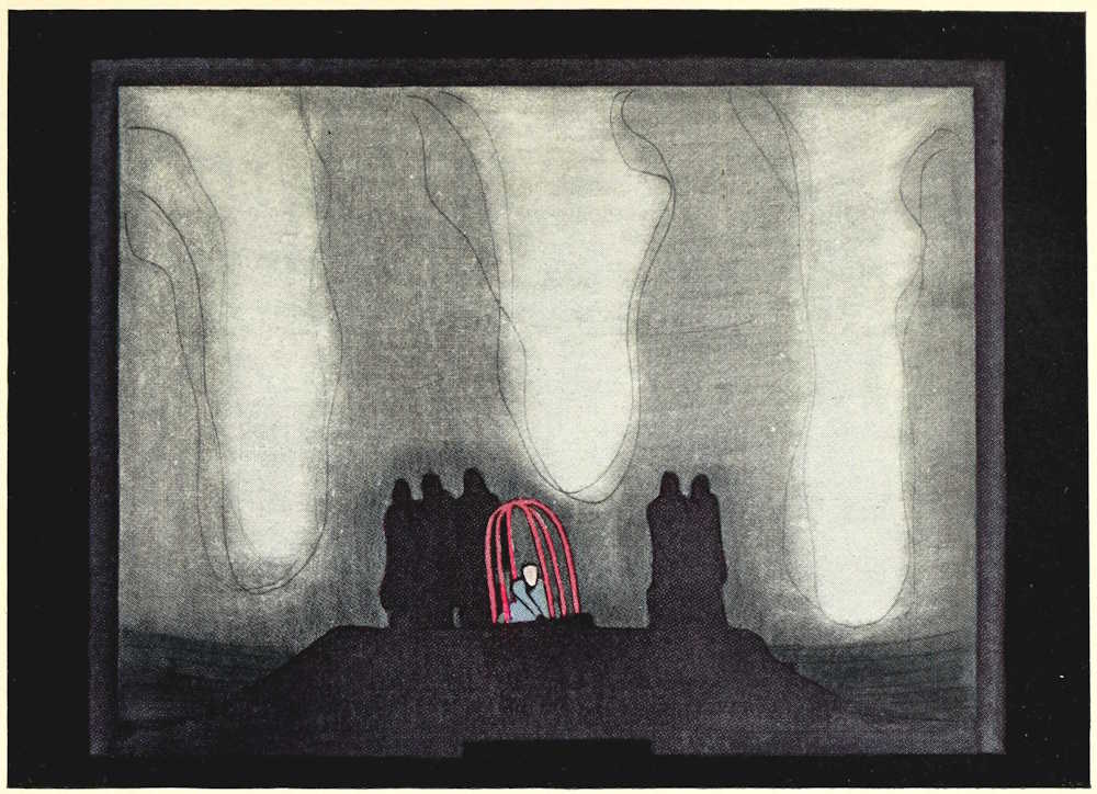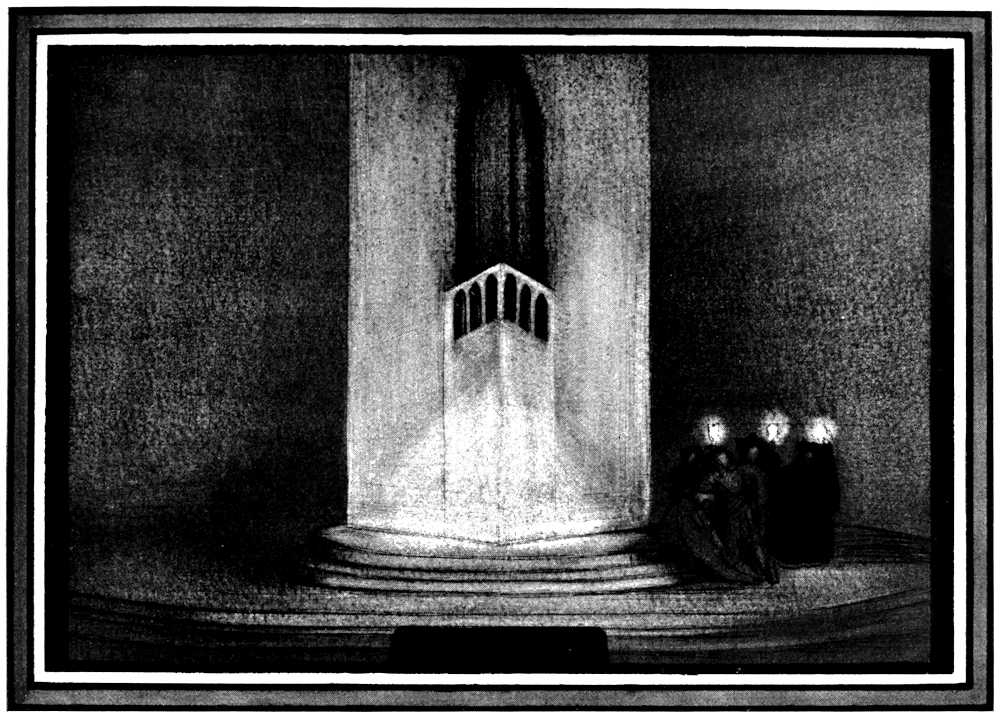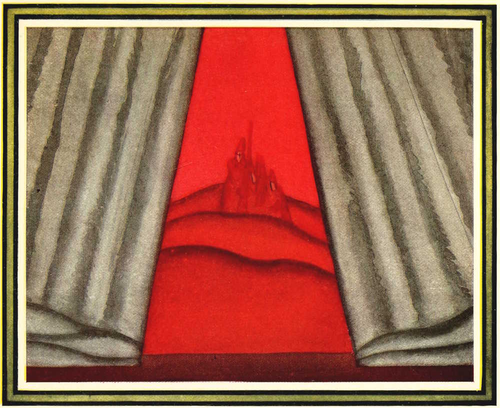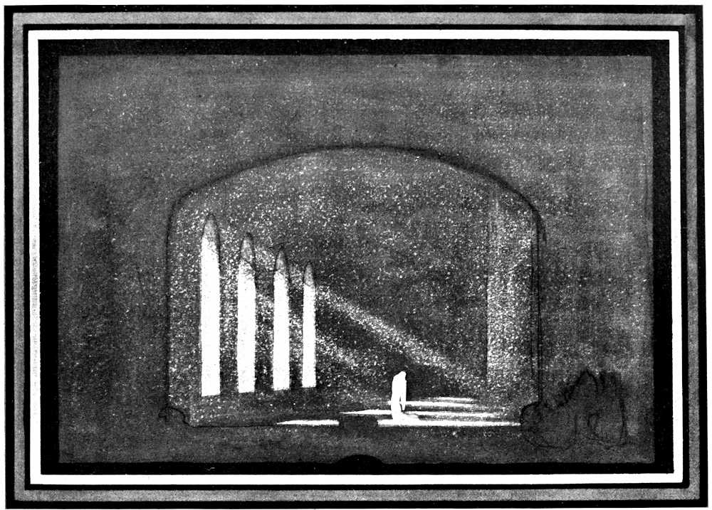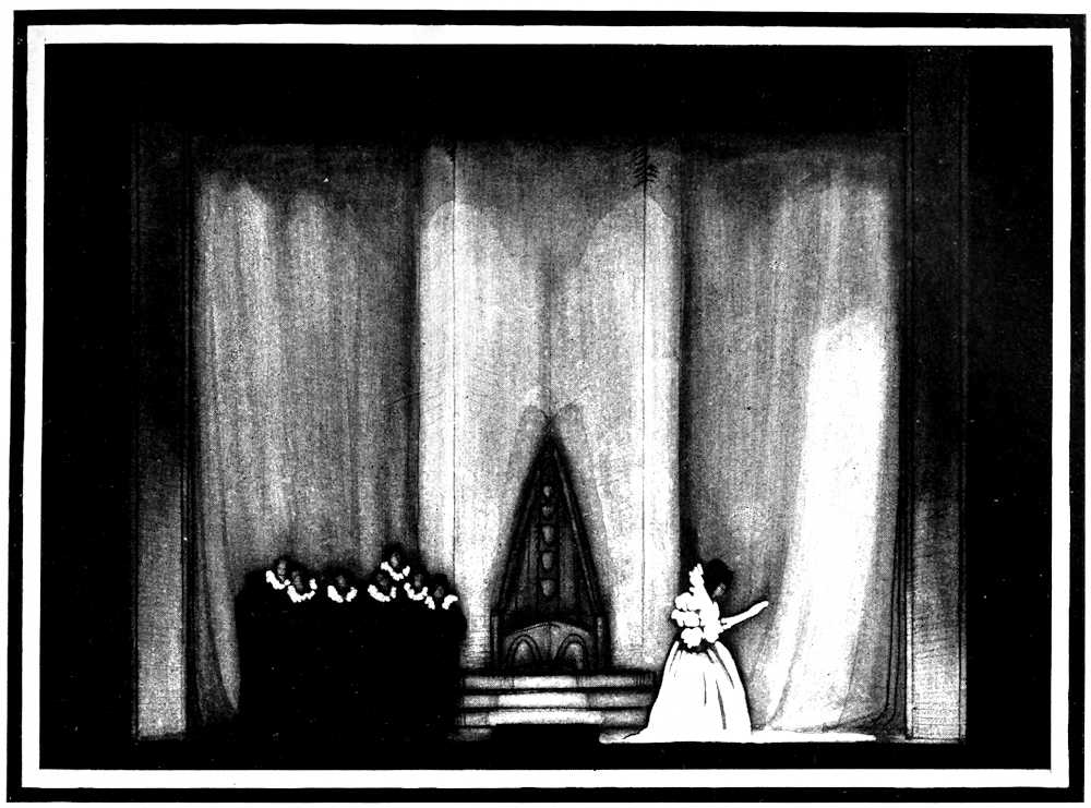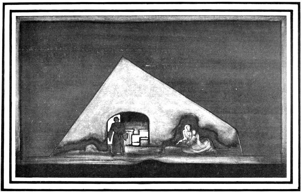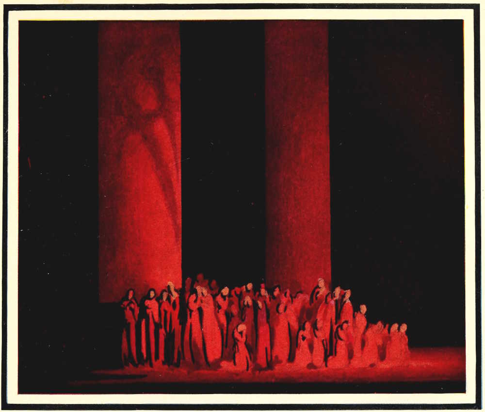 | From Appia’s theories of the ’nineties to the day of projected scenery. Lamps of six thousand candle-power. Color comes under control. The dome no longer a sky; a neutral boundary in Jessner’s Othello, a void in Masse-Mensch, a wall to be painted with light in a Stockholm ballet. Settings projected by Linnebach and Hasait. Light as a dramatic motif. | ||