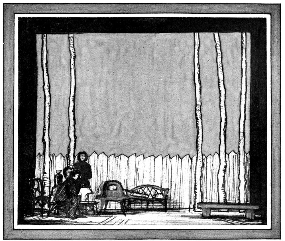 The idea of a permanent room in which to act a related repertory is thoroughly applicable even to our peepshow playhouses with their prosceniums. It would be possible to install a shell or room on the stage of any reasonably presentable theater, such as Henry Miller’s, the Little, the Booth, the Plymouth, the Selwyn in New York, the Künstler in Munich, the Volksbühne, the Kammerspiele in Berlin, the Comédie des Champs-Elysées in Paris, St. Martin’s in London. The room would have to be formal, probably without a ceiling, and certainly far more like a wall than a room. Such a compromise seems the only chance America may have of experimenting with the idea of the Redoutensaal. There is nowhere in this country a room so naturally fitted to the purpose by its beauty[Pg 194] as was the ballroom of the Hapsburgs. The building of a fresh structure is a little too much to ask; for we have hardly the directors or actors to launch unpractised upon such a costly and critical test. It might be risked perhaps, as Frank Lloyd Wright proposed risking it, in a theater of a purely artistic nature far from Broadway. Wright designed for Aline Barnsdall a playhouse to be erected in California, with an adjustable proscenium, a stage with a dome that all but continued over the auditorium, and, upon the stage, a plain curving wall some ten feet high, following the shape of the dome. The nearest analogy to the Redoutensaal that has been actually attempted in America is probably the adaptation which Director Sam Hume and the artists Rudolph Schaeffer and Norman Edwards made of the Greek Theater in Berkeley, California, for Romeo and Juliet and Twelfth Night. There is a certain significance, however, in the pleasure which our scenic artists seem to get out of a play which gives them only one setting to design, but which requires them to wring from it, by means of lights, many moods and a variety of visual impressions. Lee Simonson’s circus greenroom for He Who Gets Slapped and Norman-Bel Geddes’ sitting room for The Truth About Blayds showed how seductive to the artist of the theater may be the game of playing with lights in a permanent setting.
