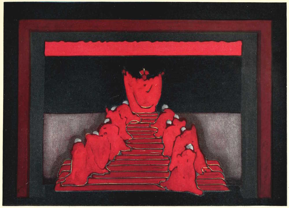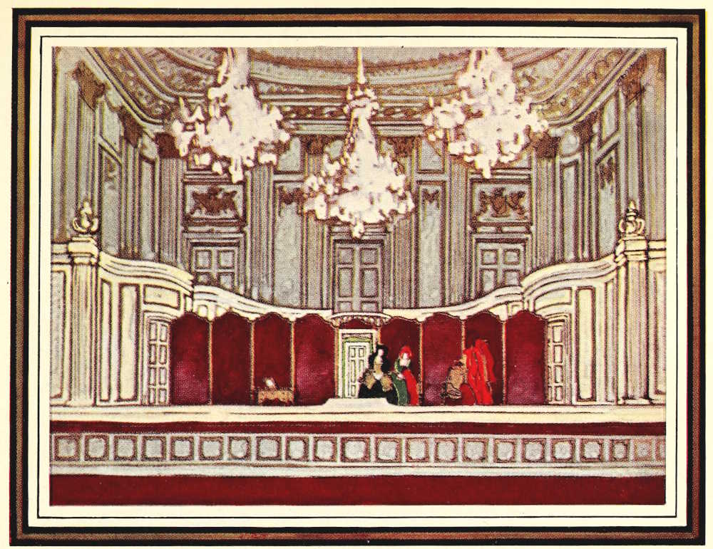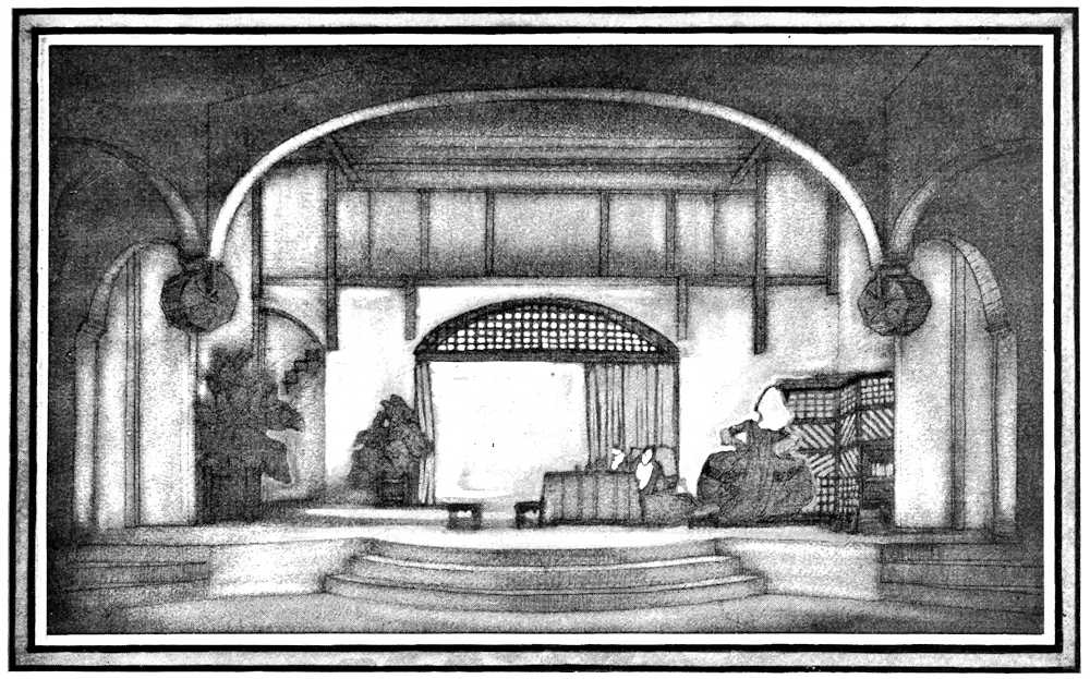 They had paid good money at one of the doors of that extraordinary old building, the Hofburg, which rambles from the[Pg 185] Opera to the Burgtheater half across the shopping district of Vienna. After they had parted from two or three thousand crowns apiece, they had wound up stone stairways between white walls and twists of old ironwork, passed through cloakrooms where princesses once left their wraps, and a supper room where artists may cheerfully go mad over molding, pediment and mirror, and reached at last the Theater in dem Redoutensaal. They found one of the handsomest baroque rooms in Europe holding within its beauty both a stage and an auditorium. A row of Gobelin tapestries filled the lower reaches of the walls. Above were moldings and pilasters, cornices and pargeting, spandrels and pediments, fillets and panelling, an ordered richness of ornament that held suspended in its gray and golden haze mirrors that echoed beauty, and chandeliers radiant with light. At one end of the room, beneath great doors and a balcony which the architect had planned in 1744, was a new structure; it broke the line of the Gobelins, but continued the panelling, freshened to cream and gold, in a curving wall across a platform and in double stairs leading to the balcony. With man’s unfailing instinct for the essence of life, the audience promptly identified this roofless shell as a stage. There was a platform, of course, but there was no proscenium. There were doors and windows in the curving wall, but no woodwings, borders, flats, or backdrops. There was even a something along the front of the platform which might conceal footlights, but[Pg 186] there was nothing to be seen that looked more like scenery than a row of screens.