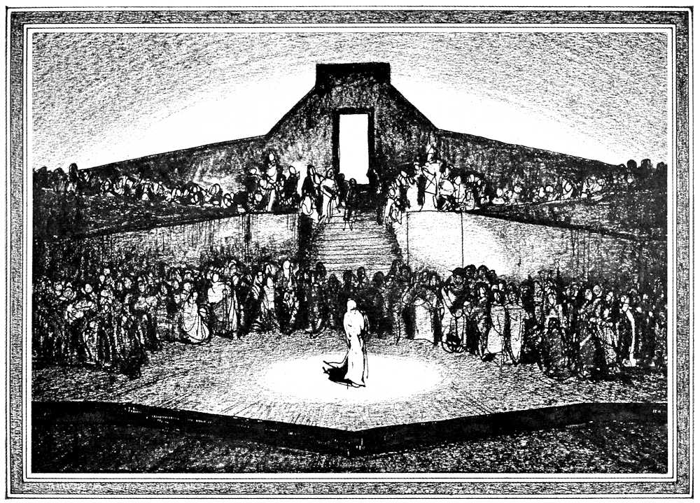 So far as the feelings of the Drama can be learned, she did not approve of the way the Romans shoved her actors out of the old Greek orchestra, and crammed them into a shallow little box, which they called a stage. The first chance that the Drama had, she climbed down close to the people again, and[Pg 199] played on the stone floor of the medieval churches. Even Shakespeare did not have the temerity to try to put her back in a box. It is said that there were rare times, as in some of the outdoor mysteries of the Middle Ages and while the pageant wagons carried the actors and their scenes into the squares of the English towns, when you might have found the Drama entirely surrounded by the hosts of her admirers. But some curious and perverse power seems to have schemed through the centuries to seize a decadent time like the Roman days or the last fifty years in modern Europe, and clap the Drama in a box. And to-day, when the Drama is bravely insisting on a little air and light, the power is still strong enough to keep the Drama’s liberators from placing her naked and unashamed in the center of her fellows. She is no longer a peepshow lure, but we still hesitate to treat her as a goddess.