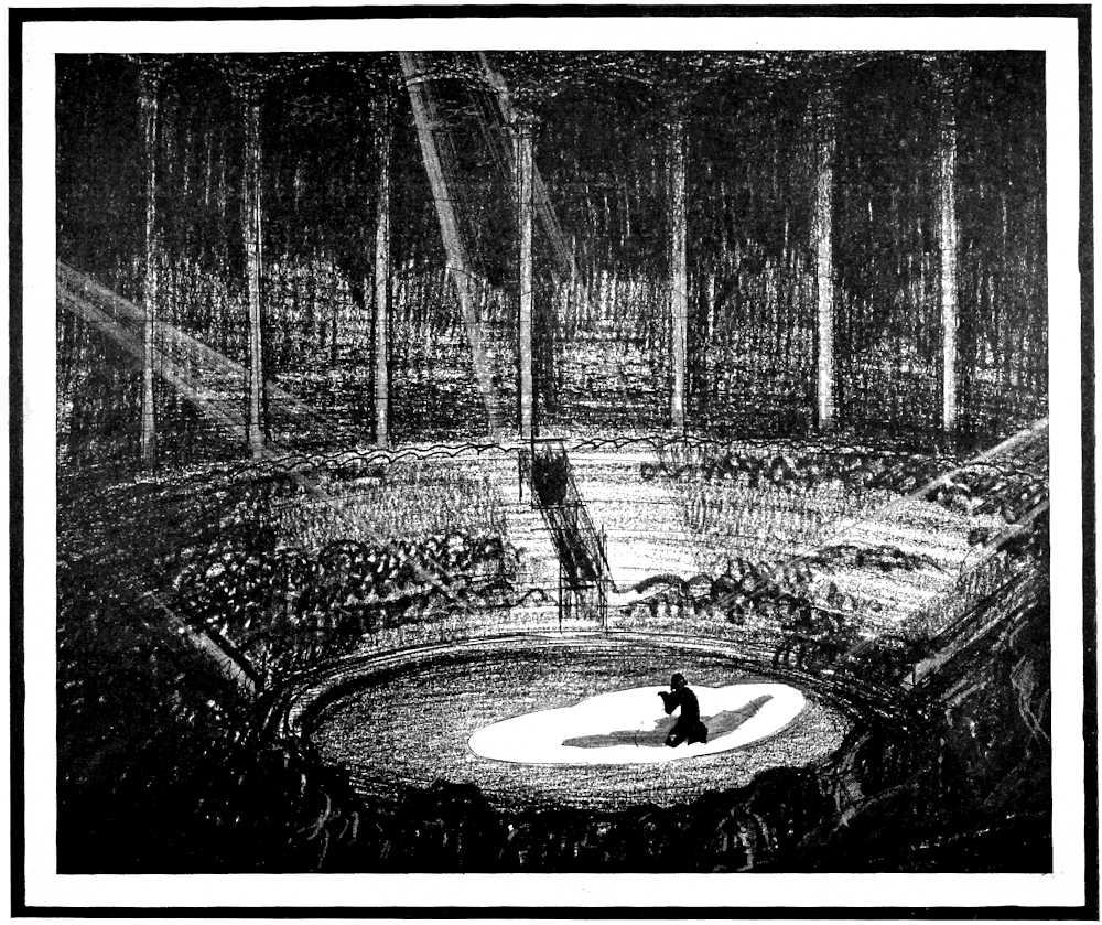 After light, there comes the human body. The Medrano as a circus does nothing to show how the actors themselves can make a setting. Why should it? But I remember the project of an American artist, in 1914, to put The Cenci upon the stage of a prize ring, and I remember how the sketches showed a chorus of human figures in costumes and with staves, circling [Pg 207]about the people of Shelley’s play and forming a dozen frames to the drama within.