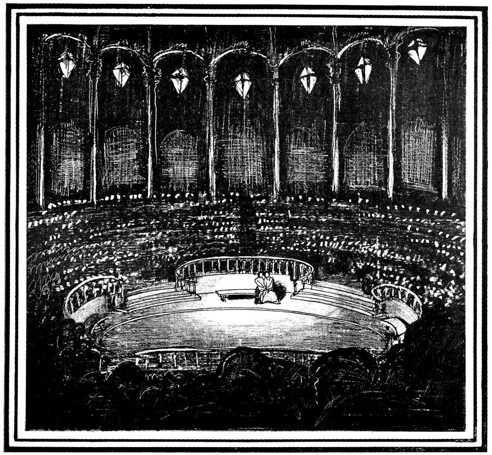 Perhaps the gladiators gave it a bad name. At any rate for twenty centuries men have hesitated to put anything more serious than a clown or an athlete in the middle of an audience. The Romans could hardly be called a timorous, a sensitive or a conventional people, yet even they never thought of presenting a play in an amphitheater. C. Curio, rich and reckless, celebrated the death of his father by building two great wooden theaters back to back, giving performances in both at the same time, then whirling the spectators about on turn tables, until they faced each other, and the two semicircles of seats joined and made one huge arena. But, though Curio was reckless of money and of the lives of his guests, he was careful of the esthetic proprieties. The actors performed in the theaters, and the animals in the arena.