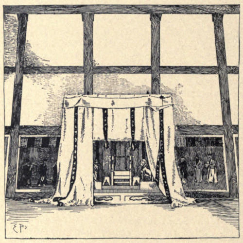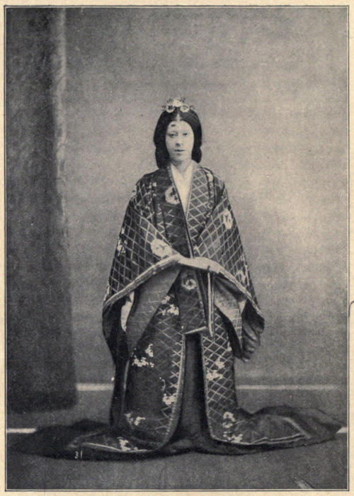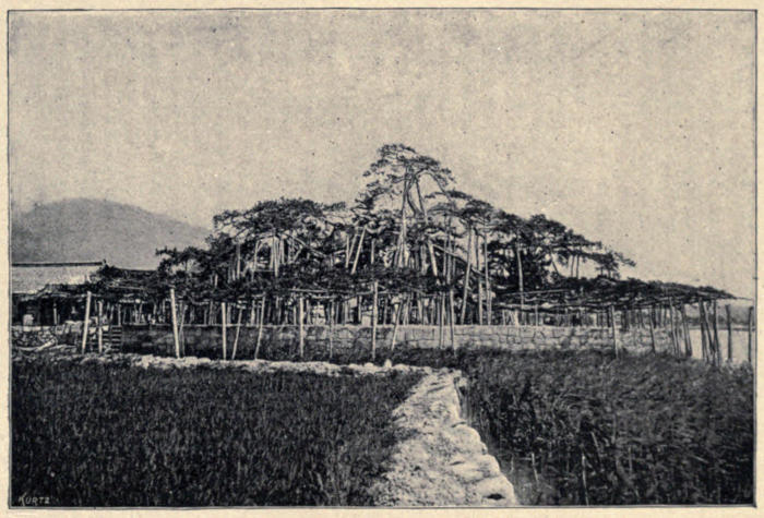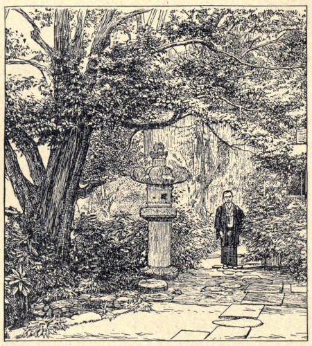 Returning to headquarters we met the commandant in such a beautiful snow-white uniform, covered with so many fine lines of white braid, as must make any man regret having to lay it aside for the dark and sombre winter regimentals. The bowing and interchange of conventionally courteous greetings between the commandant and the two Tokio officials whom we accompanied was a charming exhibition of the old etiquette, just a little modified by the new. The cool, shady room, where tea and cake and wine awaited us, had been built on the foundations of the old house where Hideyoshi lived, and its interior was panelled and ceiled with wondrous paintings and carvings brought from one of the Taiko’s distant castles. Before it stood a pine-tree, planted by the daughter of that Napoleon of Japan, and there had been enacted the brilliant drama of feudal life which Judith Gautier has immortalized in The Usurper, a story which invests Osaka’s castle with romance.