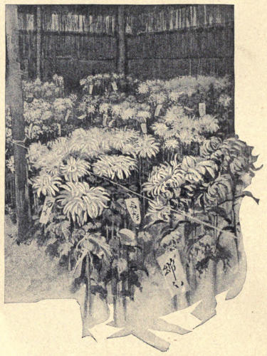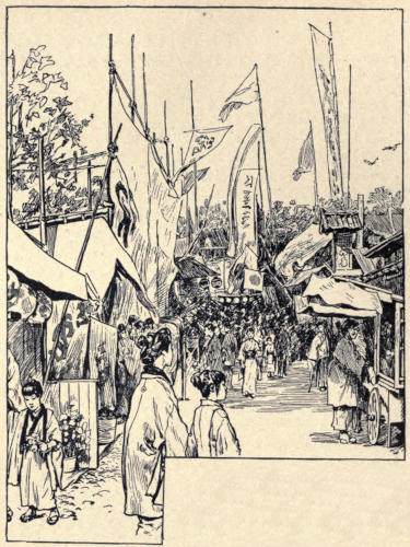Another interesting Government institution is the bazaar for the exhibition and sale of goods of Osaka manufacture. All Japanese cities have these hakurankwai (exposition), but no other is on so great a scale and so crowded with beautiful things as this one. There one may see all that any workshop turns out or any dealer has for sale without the tedious process of bowing, taking off one’s shoes, and sitting in tailor-fashion for an hour before the desired articles are shown. All the goods are marked in plain figures, and the fixed price obviates the bargaining and the rattle of the soroban. There is an admission fee of a few coppers, and a percentage is charged on all sales to support the institution. One may spend a day in the labyrinth of rooms studying Osaka’s many industries; and everything, from gold and silver ware, crapes, brocades, lacquers, enamels, porcelains and carvings to food preparations, patent medicines, and imitations of foreign goods, is to be found there. There is even a department of plants and flowers, a hall of antiquities, a section of toys, acres of china shops, and specimens of everything made, sold, or used in that bustling city. Evening brings electric lights and a military band, and this industrial fair is made popular and profitable all the year round.