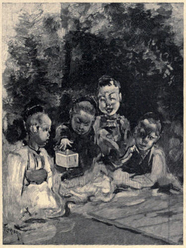 In 1885, the year of the great cholera epidemic, the village of mining employés was almost depopulated. The harbor was nearly deserted, the American and English mission stations were closed, and the missionaries and their families fled to Mount Hiyeizan. Only the Catholic fathers and the nuns remained, much to the concern of the governor and officials, who begged them to go. On our way to China we touched at Nagasaki while the epidemic was at its height, but no passenger was allowed to go ashore, and all day we kept to the decks that were saturated with carbolic acid. It took six hours to coal the ship, and from noon to sundown we beheld a water carnival. As the first coal-barge drew near, a man in the airy summer costume of the harbor country—which consisted of a rope around his waist—jumped over the side and swam to the stern of our steamer. He was like a big, brown frog kicking about in the water, and when he[368] came dripping up the gang-way the faithful steerage steward gave him a carbolic spraying with his bucket and brush. The barge was hauled up alongside and made fast, and our consignment of coal was passed on board in half-bushel baskets from hand to hand along a line of chanting men and women. Nothing more primitive could be imagined, for, with block, tackle, windlass, steam, and a donkey engine on board, it took a hundred pairs of hands to do their work. At the end of each hour there was a breathing spell. Many of the women were young and pretty, and some of them had brought their children, who, throwing back the empty baskets and helping to pass them along the line, thus began their lives of toil and earned a few pennies. The passengers threw to the grimy children all the small Japanese coins they possessed, and when the ship swung loose and started away their cheerful little sayonaras long rang after us.