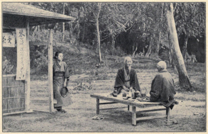 In the last week of June, the proprietor of the tea-field beneath our veranda conducted a second picking of his stumpy little bushes. From sunrise until dusk rose a chorus of children’s voices beyond the hedge. The first and best crop having been gathered weeks earlier with the first fire-flies, this hubbub accompanied only the gleaning after the harvesters. It was a pretty picture in the foreground of the magnificent view—these little blue and white figures in huge wash-bowl hats, with touches of bright red here and there in their costumes. The headman sat comfortably under a fig-tree, with no clothing to speak of, smoked his pipe, and watched the youngsters at work. When they toiled up to him with full baskets, he weighed the load with a rude steelyard and sent them back, so that some of the tea-pickers were always moving up and down the paths between the compact rows of bushes, and grouped about the patriarch under the fig-tree. The leaves were spread in the sun all day and carried off at night in large sacks and baskets. Walking out through the woods one day, with two little red-gowned priestesses from the Kasuga temple, we came upon a tiny village, and there found the same tea-leaves being toasted in shallow paper-lined baskets over charcoal fires. The attendants rubbed and tossed the fragrant[321] leaves, that were soon dried enough to suffice for the home market.