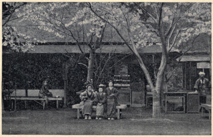 Others fill little bottles with the water and carry it home as a specific against many ills. In a pond near by live hundreds of turtles. The kamé climb up on wooden platforms in the pond and sun themselves, but at the clap of the hand and the sight of popped beans floating[340] about, the whole colony dive off and swim towards their benefactor.