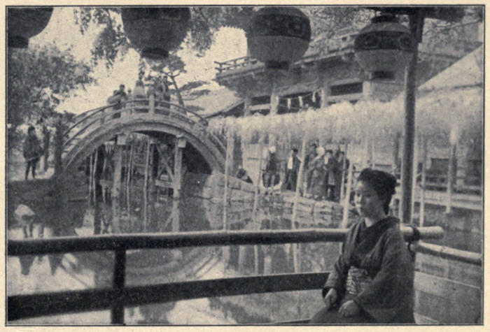 In the city itself only the castle and a few business streets were left above water, and thousands of houses and godowns were ruined; the mud-walls under the heavy tiled roofs collapsing like card-houses in the current. One hundred and forty-six bridges were carried away, and, for a time, boats were the only vehicles and means of communication. The suffering and destitution were terrible, and Osaka’s many industries were paralyzed. But in the shortest time after the subsidence of the waters temporary bridges and ferries were established, embankments patched up, houses rebuilt, and the city returned to its busy ways. Except for the mud-stained walls and the heaps of drift and débris on roof-tops, little reminded one of the disaster as we sped through the stone-paved streets. House-boats went up and down the river each evening with geisha and maiko singing happily, and koto and samisen ringing on the air till midnight. Jiutei’s queer hotel, a foreign inn up-stairs and a Japanese tea-house below stairs, was the scene of as much feasting as ever, and the recuperative power of Osaka’s people surprised one at every turn.