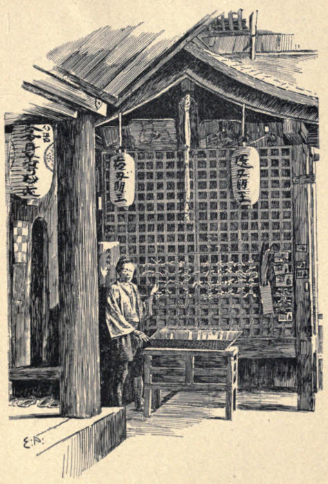 In a tall sheathed bell-tower near the pagoda there is a most interesting shrine where parents hang the garments of sick and dying children. The whole interior is filled with little kimonos and bibs, and the long rope of the gong overhead is covered with them, while tearful women cluster round the priests in the small interior, and a continuous service seems to go on before the altar. In the court-yard a large stone water-tank, sunk a few steps and covered with a pavilion roof, contains a stone tortoise pouring a constant stream of water into the reservoir, on whose surface the faithful, buying wooden shavings or prayer-papers from the priests, cast these petitions and go away content.