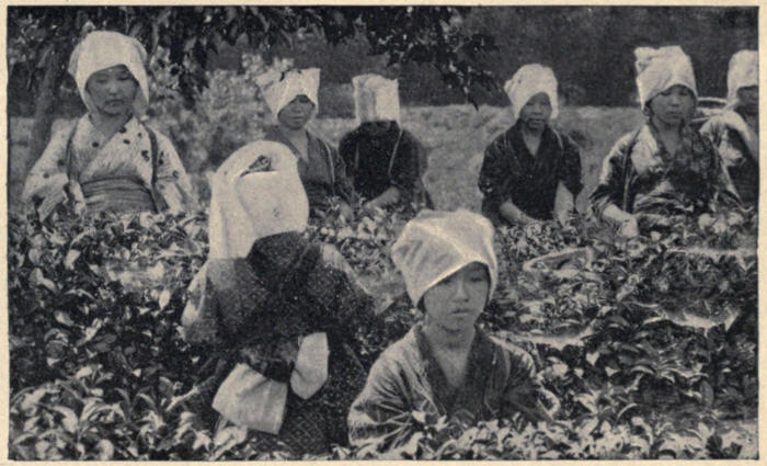 The tea-plant, as every one knows, is a hardy evergreen of the camellia family. It grows a thick and solidly-massed bush, and at a first glance at a field regularly dotted and bordered with the round bushes setting closely to the ground, one might easily mistake it for box. In the spring the young leaves crop out at the ends of the shoots and branches, and when the whole top of the bush is covered with pale golden-green[351] tips, generally in May, the first picking takes place. The second picking belongs to the fire-fly season in June, and after that great festival tea comes in from the plantations in decreasing quantities until the end of August. The choicer qualities of tea are never exported, but consumed at home. Choice basket-fired tea, such as is used in the homes of the rich and well-to-do Japanese, sells for one and two dollars a pound. There are choicer, more carefully grown and prepared teas, which cost as high as from seven to ten dollars a pound; but such teas are shaded from the hot suns by matted awnings, and the picker, going down lines of these carefully tended bushes, nips off only the youngest leaves or buds at the tip of each shoot. The average tea, bought by the exporters for shipment to the United States and Canada, is of the commonest quality, and according to Japanese trade statistics, the average value is eleven cents a pound as it stands, subject to the export duty and ready for shipment abroad. There are often sales of whole cargoes of Japan tea at auction in New York for fifteen cents a pound. Families who buy this same brand from their grocers at forty or sixty cents a pound may judge to whom the greater profits accrue.