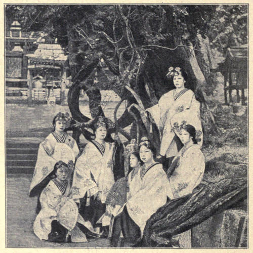 Although secular occupations prosper, and Nara cutlery and ink rank high in public favor, the temple life of Nara is its real existence. Every day pilgrims and tourists passed before us in processions whose variety of people and costumes was endless. Yet in all the weeks the European coat and trousers only once appeared in those sacred aisles. Every morning two or more of the little red-robed priestesses came, hand in hand, to spend an hour or two beside my friend’s easel. The old priests, in their white gowns and purple skirts, were very courteous and hospitable, and as our stay lengthened we grew to feel ourselves a part of the sacred community. The little priestesses carried us to their homes to drink tea, and the priests brought their friends to watch the methods of the foreign artist. Among the sightseers and visitors to the Shinto shrines and their guardians were many Buddhist priests, whose shaved heads and black or yellow gauze gowns made them conspicuous. The priests of the two faiths seemed to fraternize and to treat each other with the greatest consideration. Their speech, as we heard it, was always so formal, so gentle, and so loaded with honorifics and the set phrases of politeness that there could never have been any theological controversies. A few Buddhist nuns, also, made pilgrimage to Kasuga’s ancient groves; creatures unfeminine and unbeautiful enough in appearance to be saintly in the extreme. They wear white kimonos under gauze coats, with a skirt plaited to the edge of them—the same costume that priests wear—and they shave their heads with the same remorseless zeal. These bald-headed women give one a strange sensation, for in the absence of their dusky tresses their eyes appear too prominent, and it is easy to perceive an unnatural, snaky glitter in them. There are several nunneries near Nara and one[322] in Kioto, but all the inmates assume the same priests’ dress and shave their heads, and we inferred that all the six hundred Buddhist nuns in the empire were equally ugly.