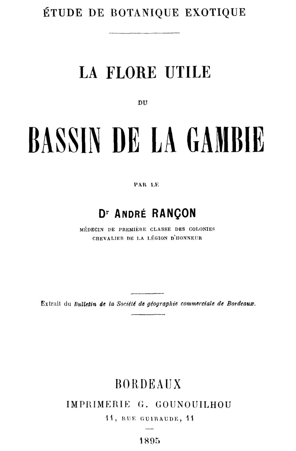 Dans un programme d’étude aussi vaste il n’est pas, à notre avis, de travaux, si petits et si insignifiants qu’ils paraissent, qui n’aient leur importance. Aussi avons-nous cru qu’il serait de quelque intérêt de faire une revue rapide de la Flore utile du bassin de la Gambie et de faire connaître les végétaux que l’on peut rencontrer dans ces régions, encore peu explorées, ainsi que le parti que l’on pourrait en retirer pour notre commerce et notre industrie.