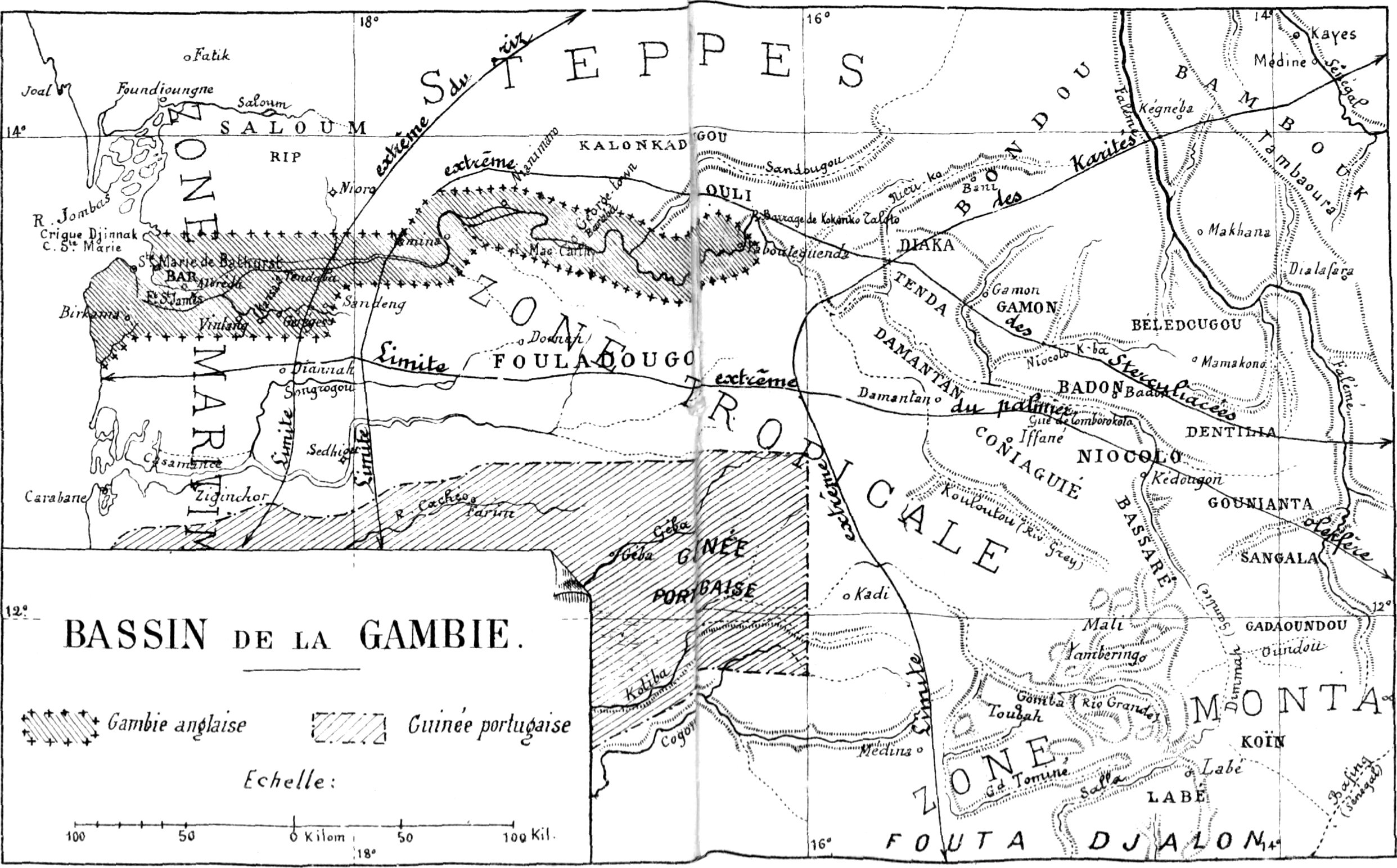 La Gambie est, après le Congo, le Niger et le Sénégal, le plus grand fleuve de la côte occidentale d’Afrique. Elle prend[2] sa source dans le pays de Labé, à 30 ou 35 kilomètres au nord de cette grande ville noire, dans les environs du petit village peulh de Orédimmah. Ses sources ont été particulièrement visitées par Hecquart, Bayol et Noirot. Ce n’est d’abord qu’un mince ruisseau, que les indigènes désignent sous le nom de Dimmah. Elle prend rapidement une importance considérable par suite de l’apport des eaux d’un grand nombre de marigots qui descendent du versant est du contrefort que le Fouta-Djallon émet au nord, dans cette région. Les habitants lui donnent alors le nom de Gambia, qui lui reste jusqu’à son embouchure. C’est aussi le nom que lui avaient attribué les premiers voyageurs qui l’ont explorée. Non loin des sources de la Gambie se trouvent celles du Rio Grande, la Comba des indigènes. Quelques kilomètres seulement les séparent l’une de l’autre.