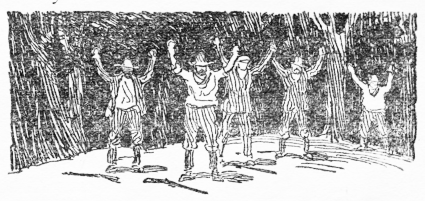 The utter surprise of it and the terrifying effect of those two shots from unseen marksmen did the trick. The mountaineers were a bit too far from the shelter of the forest to risk a break for it against unknown odds. Their rifles dropped to the ground and six pairs of hands thrust slowly into the air.