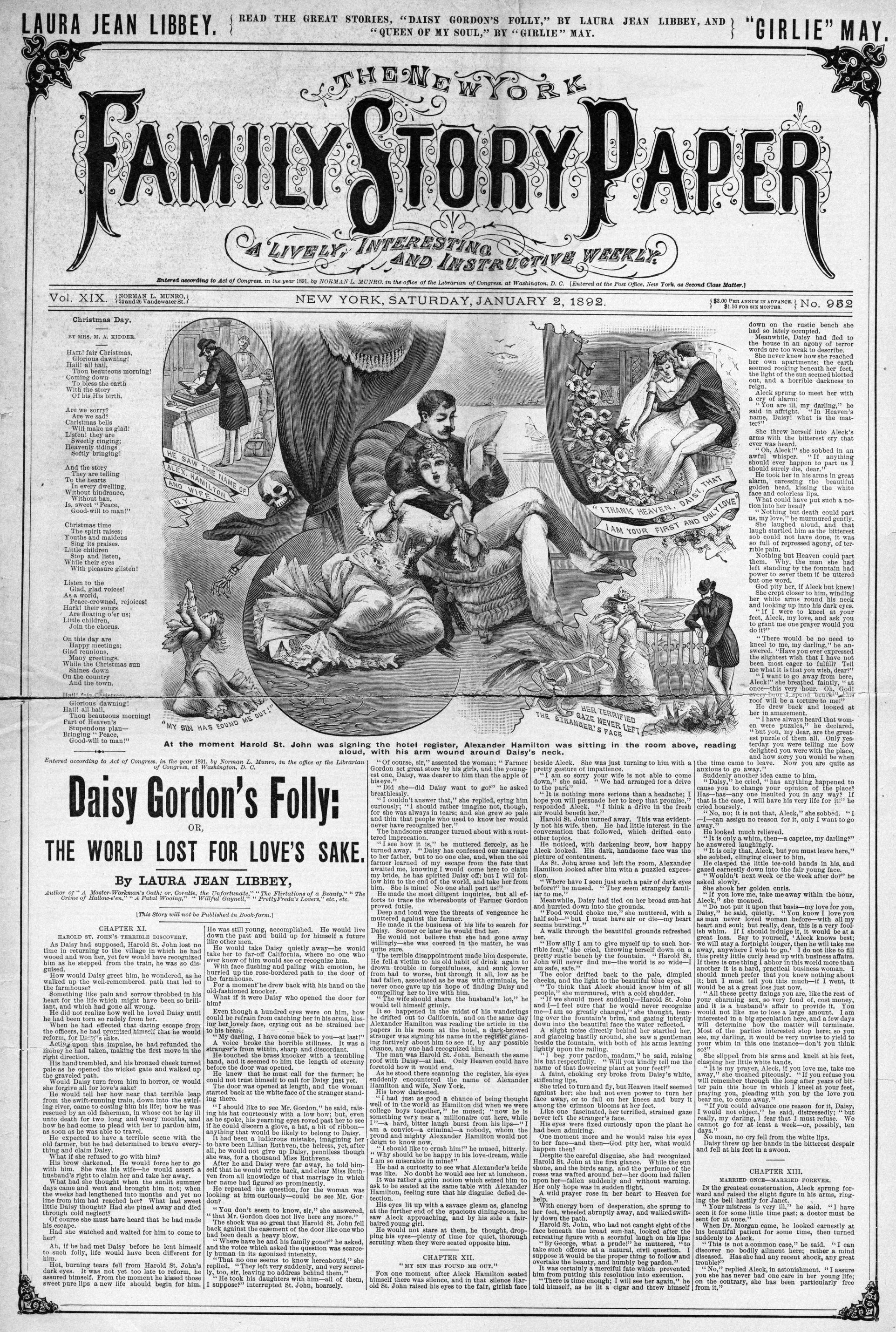 This story was originally serialized in Norman L. Munro’s New York Family Story Paper, volume XIX, numbers 952-955 (January 2-23, 1892).