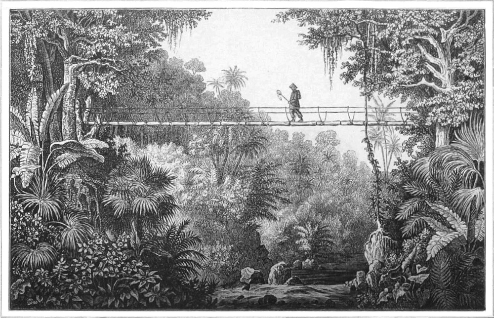 21. Juli. Heute ging ich nicht weit, nur 10 Paal bis Kaju-Tanam. Schön und freundlich war es diesen Morgen; die Sonne schien so bescheiden,[S. 8] daß ich der Nähe des Aequators ganz vergaß. Einige Vögel sangen, zwar nicht mit so gewandter Kehle wie in Europa, allein für ein Tropenland artig genug; Affen schrien, lärmten und sprangen von Ast zu Ast. Auch die Gegend war schöner, die Gebirge großartiger und wechselnder in den Formen; die höchsten Berge, der Singallang und Merapi, sind 9 bis 10,000 Fuß hoch.