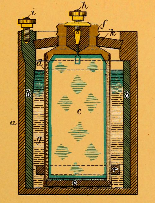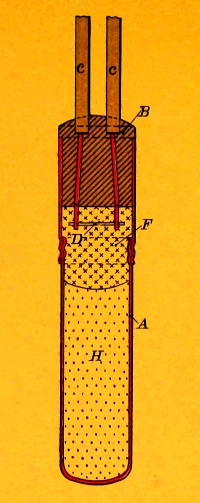 In the center of each cover, around the hole for the entrance of the leading-wires, is a brass rim fitted with a screw-thread outside, and bored out, inside, with a slightly conical taper, providing a seat for the packing.