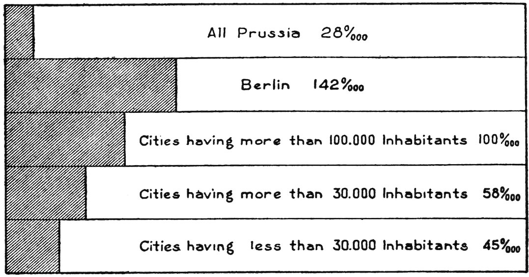 The inordinately large contingent of servants is partially accounted for on these lines; for the servant has given up her own home and does not always make for herself another in the house she serves. She has come from the landless country proletariat, where sexual intercourse is either customary or not forbidden; in the city, exposure and weak resistance make her a frequent victim. Servants between 16 and 30 years old form one-fourth of the female population of Berlin; they bear one-third of the illegitimate children of the population. Of the registered prostitutes of Berlin in 1900, 60% had traveled this road.[154] In Paris, of 6,842 clandestine prostitutes arrested and found ill within the decade 1878–1887, 2,681—i. e., 39.18%—were domestics.[155] Two hundred and eighty-four of Lindblad’s 77800 patients were servants, 80 more were attendants on little children, 170 charwomen.[156]