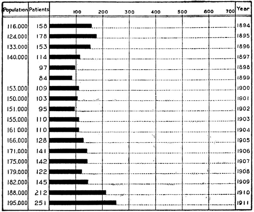 664. Aarsberetning angaaende Sundhedstilstandet i København for 1910. (Copenhagen, 1911) p. 36. The figures for 1911 above given were contributed by Stadslæge Dr. E. M. Hoff.