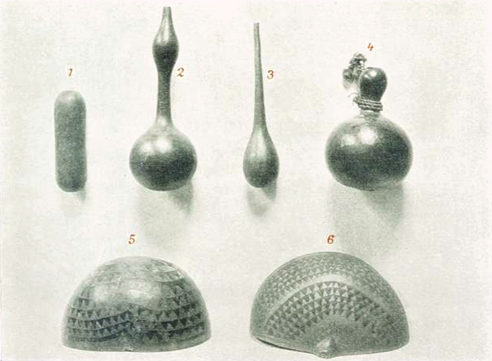 5. 6. Verzierte Mehlbehälter aus Kürbisschale