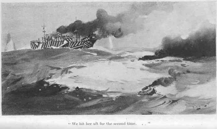 With gloomy countenance I curtly remarked: "The port torpedo broke surface and then dived underneath her, the starboard one missed astern."
