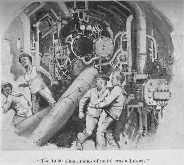 So far all had gone well, but ten minutes later I nearly made a fatal error. We had been diving for several hours, the atmosphere was bad, and as it was dusk I decided to come up, ventilate, and put a charge on the batteries. I gave the necessary orders, and was on my way up the conning tower to open the outer hatch. The coxswain had just announced that the boat was on the surface, when a terrible thought paralysed me, and I clung helplessly to the ladder trying to think out the situation.