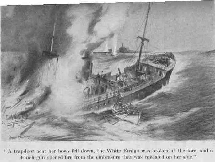 The First Lieutenant suggested that we should give her gunfire, but I pointed out that I had good reason to suspect her of being a wolf in sheep's clothing, and as he had not seen her he could hardly question my judgment. I was going forward, when I accidentally overheard the Navigator and the Engineer talking in the wardroom. I listened.
