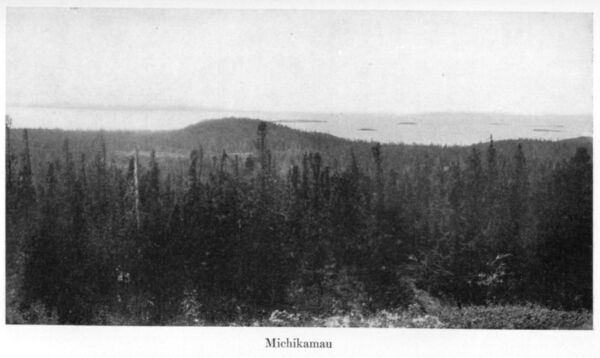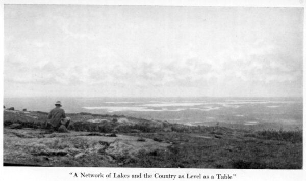 The trail which runs N. 50 degrees W. and has not been used for eight years, gradually became more and more indistinct, until on Bibiquasin Lake it disappeared entirely. Thereafter the course was N. 70 degrees W., and finally due west, through a series of lakes which at last brought us to Lake Michikamau. The largest of this series is Kasheshebogamog Lake, a sheet of water twenty-three miles long, but broken by numerous bays and countless islands of drift, with a direction S. 75 degrees W. The lake is confined between long bowlder-covered ridges, and is fed at its western end by a small stream.